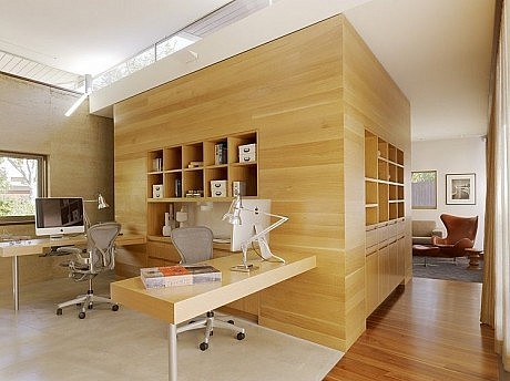 The home’s Genkan entry is a feature of Japanese houses. Exterior stone paving extends into the entry, where shoes are removed. The interior floor steps up six inches. Living functions–kitchen, dining, family room and office–inhabit the lower level, and all face a stone-paved courtyard with a Callery Pear tree. The yard beyond is landscaped with a synthetic lawn and drought-tolerant meadow grasses. An L-shaped interior façade with 65 feet of wood-framed, sliding glass doors, maximizes the indoor-outdoor connection. Circulation is a continuous flow that emphasizes the counterpoint between solid and open. The second floor contains a library plus three bedrooms and two bathrooms. An 80-foot long “gallery of light” connects the bedrooms and bathrooms; its skylights and windows are designed to animate the walls with geometric shapes derived from washes of light and shadow. The stairway between floors is located where the house bends to form an angle. It leads up through an open space that connects the library above to the home office below, with natural light filtering in from the clerestory windows at the raised roof. Across the breezeway is the garage/studio building. The studio is a general work space, but it also has a full kitchen and bathroom for long-stay guests.