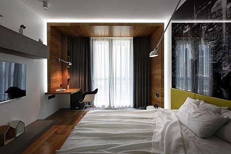 The walls are covered with panels master bedroom of genuine leather. Besides the aesthetics inherent in the car interior, this finish has helped solve the problem of sound insulation required. Ceilings, as well as floors, wood-paneled, windows dense graphite curtains – at any time in the bedroom can create a nocturnal gloom.