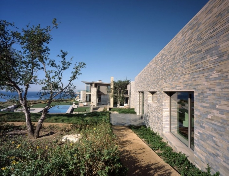Not wanting to disturb the land more than necessary, the four separate buildings–main house, study, guest house, and garage–were cut into the terrain reducing the need to grade the site. As a result, the subterranean garage and partially buried main house seem to emerge from the ground as the land slopes toward the ocean. Not only did submerging the buildings reduce the amount of site work required, it also preserved the ocean view for the surrounding neighborhood.