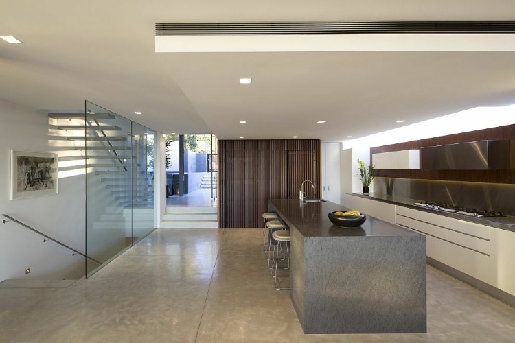 The sleeping level is positioned on the top level, providing privacy, quiet and commanding views. Our primary design generator was to link vertical and horizontal circulation through double and triple volume spaces and a dialog of floating planes and connected textural elements. Finished such as polished concrete floors internally and externally, tinted concrete bench tops, raw basalt, timber and steel are assembled in a contemporary composition to facilitate easy living and a seamless flow between inside and out.