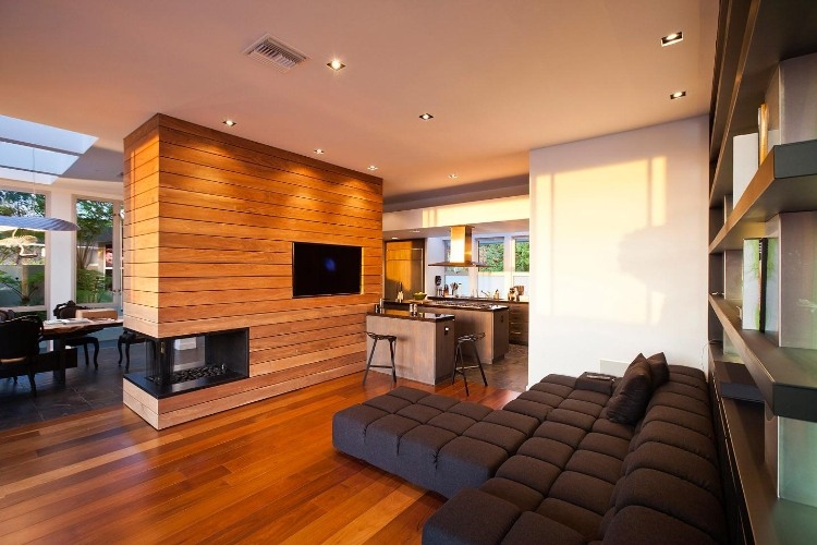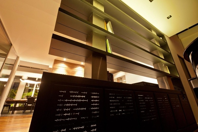Full reconfiguration of a Hal Levitt 50′s house. Partitions were replaced with shelving units to open up and connect all spaces. New ipe interior flooring extends out to the pool deck.