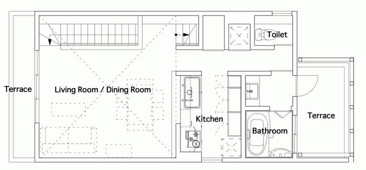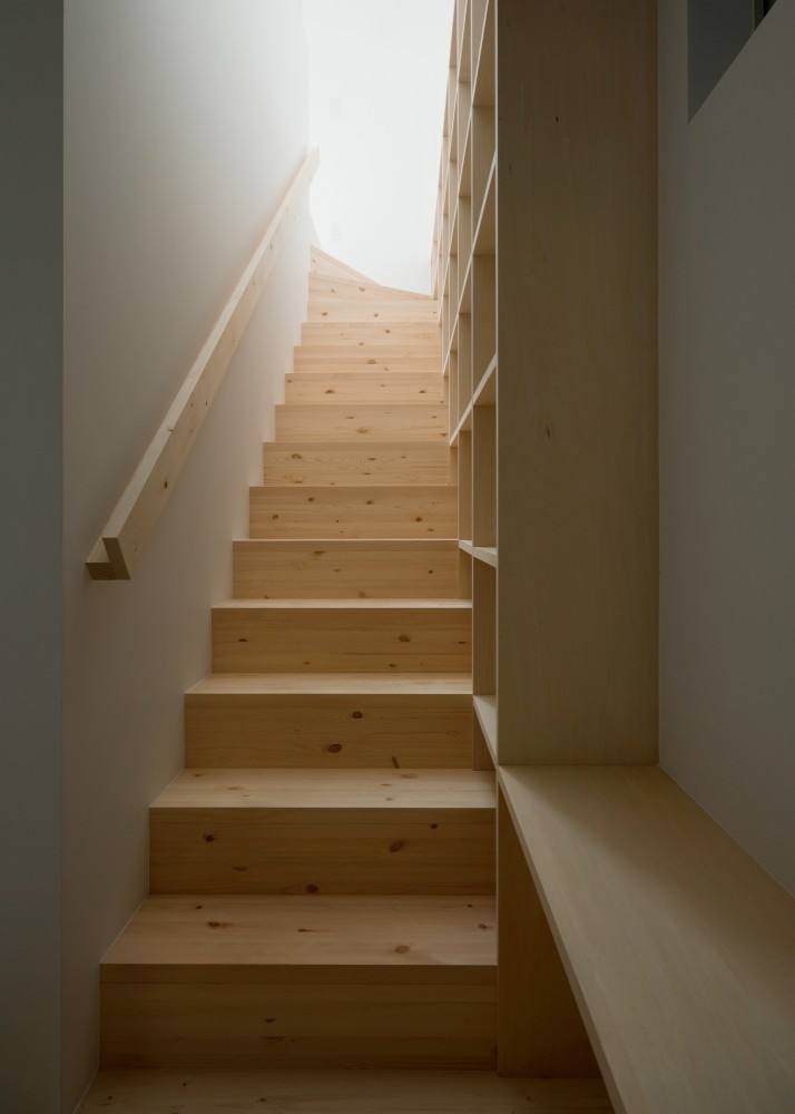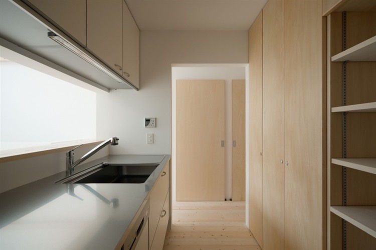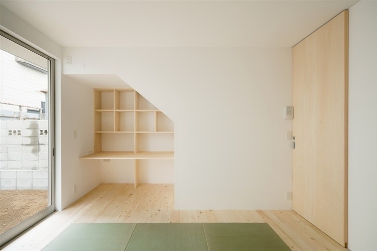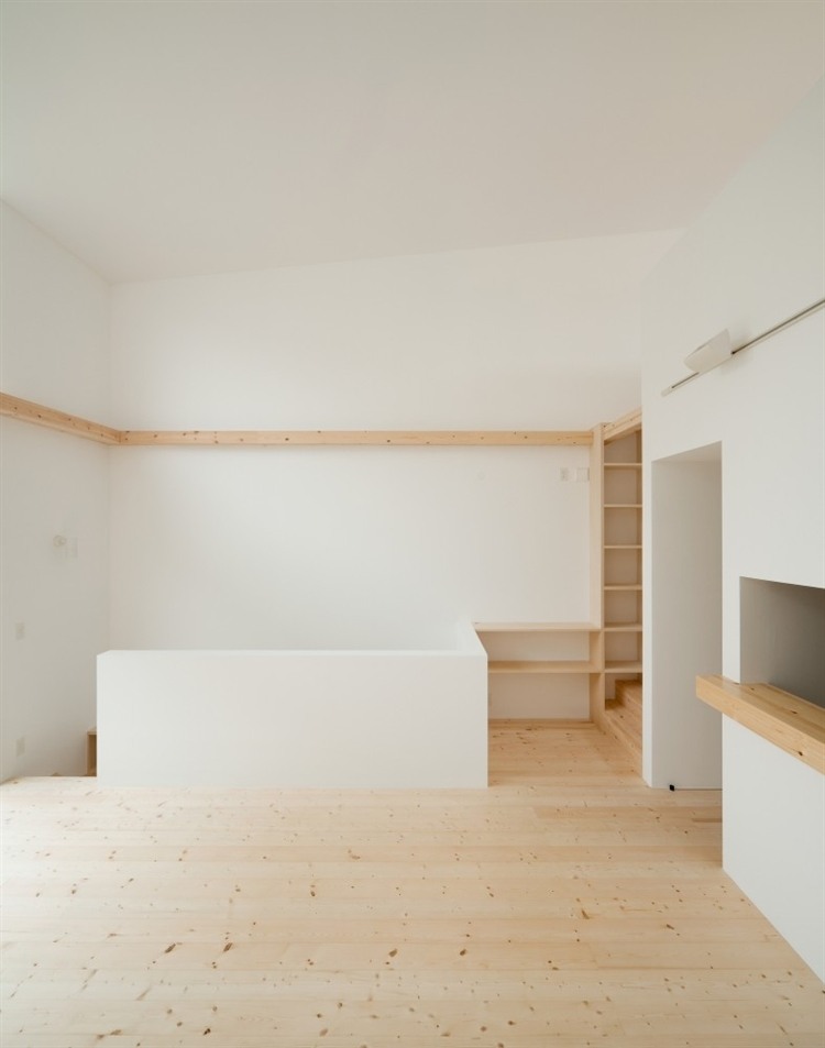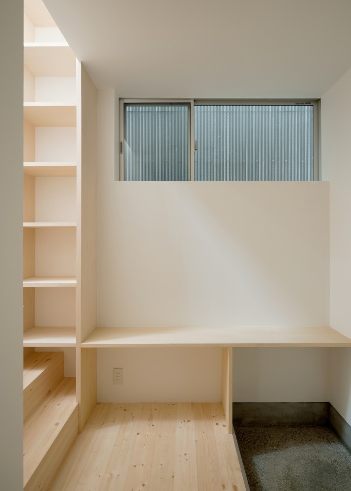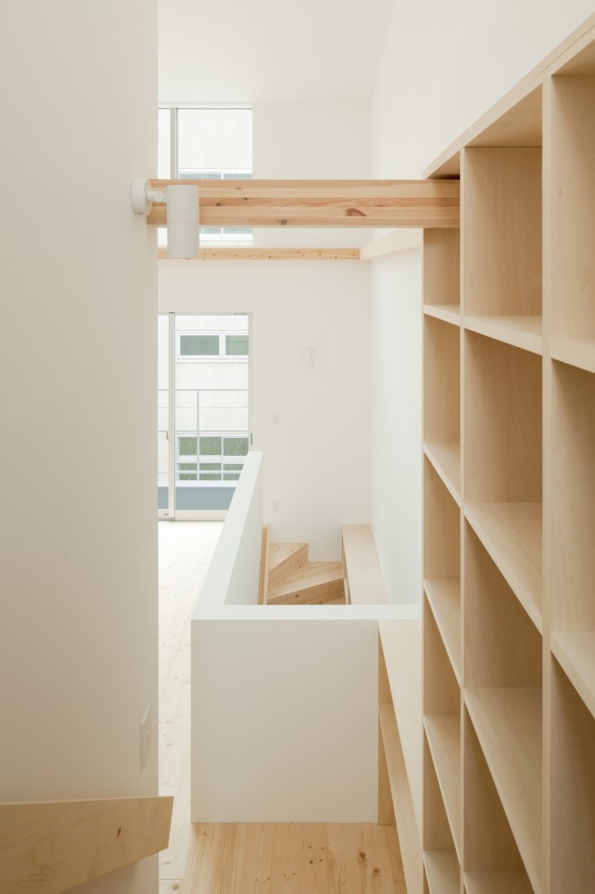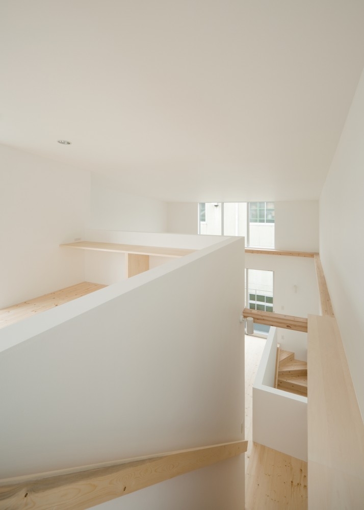 It is a wooden three storey house that is built on urban narrow site. It aimed at a quiet, soft space with the wood and the wall of painting. The space with a brightness and openness was secured, and the space and the pitch with the density were applied. The beam of the void where the wind pressure had been received and the counter of kitchen were produced with the same material, elements were united, and “Meaning” of the beam and the counter was obscured.