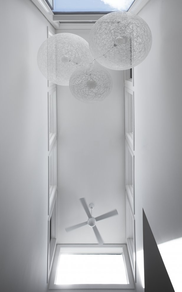 When viewed from the street, the living room is projected forwards, while the adjoining bedrooms frame the interior stair core from behind. This staircase is the highest form in the structure and is centrally located in the plan, its clerestory windows draw natural light into the home and vent stale air out. Generous overhangs keep the hot summer sun out of the home, while allowing winter sun in. Expansive black-framed operable windows, white roof plans, charcoal-colored wood siding and brick express the subtle minimalism of the home. A light-well also serves to provide natural stack ventilation, permitting interior air to be exhausted at the clerestory level above.