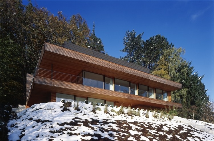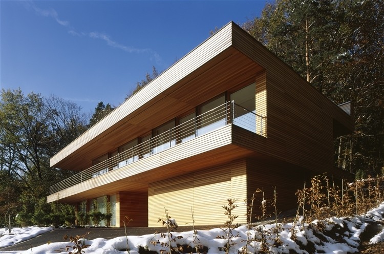 The three-floor dwelling house is situated on the slope, edge of a forest on the outskirts of Heilbronn. It faces south and offers a sublime view to the surrounding area. A floating design and the use of natural materials using concrete, glass, copper and larch as structural material characterize the single family home. Besides the structural members that establish contact with the ground, the rest of the house is constructed out of wood.