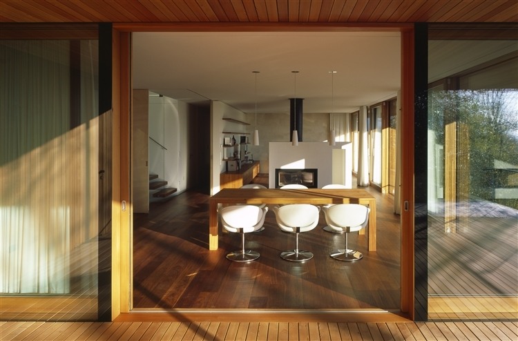 The hallway has a large wardrobe and a airy-looking stairway leads upstairs into an open-plan, cooking, eating and being area, with full height glazing on both sides, entirely surrounded with a balcony that give an impression of openness and width. The overhanging parts of the upper roof shelter the balcony and give a shade to the broad expanses of glazing, protecting the house from excessive solar grain in the summertime. In the winter, the sunshine becomes a passive source of energy. Along the northern side of the dwelling is a guest toilet, a utility room and a storage room next to the kitchen.