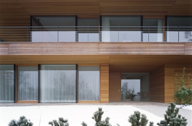 The entire façade of the building is clad with larch as well as copper on the upper volume. The house was designed according to strict considerations of sustainability, involving the ecological quality of the materials and choices such as a solar hot-water-system, geo–thermal heating and a stove in the living area.