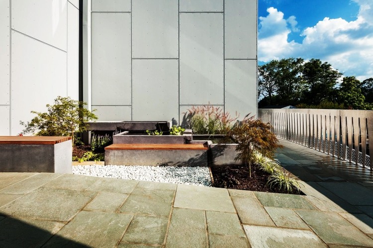 A custom designed aluminum plate guard rail defines the edge of the courtyard screening views and casts dramatic shadows.