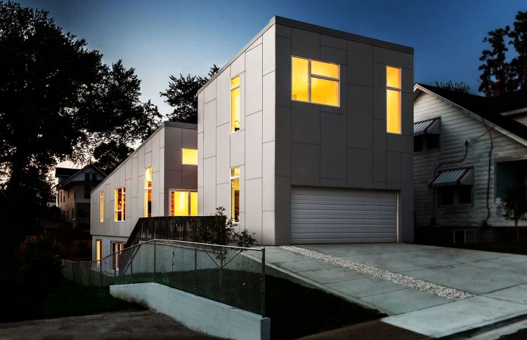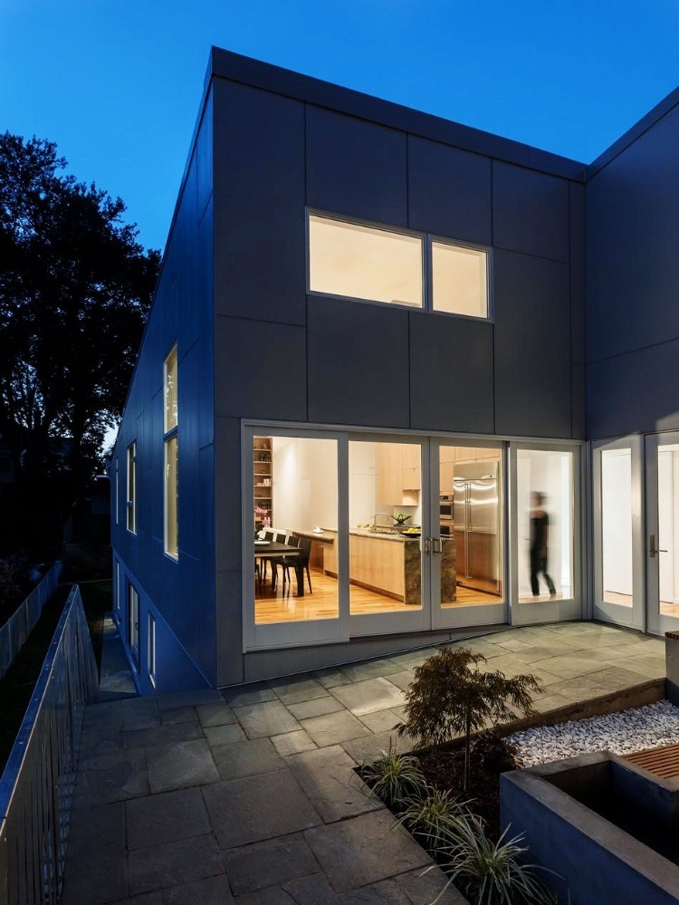 Challenged by a modest budget, the front façade is occupied by a two car garage, with the front door located off a small courtyard between the garage and the house. As the yards are too narrow to be useful, the courtyard offers an “internal yard” screened from the street by the front volume of the house.