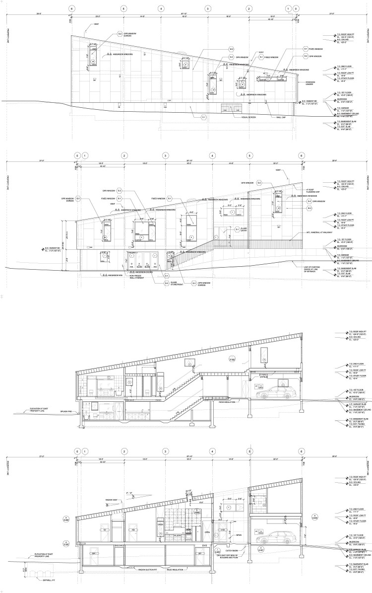 This house uses a single slope to accommodate one and two half floors: a partial walk out basement below, and an extra room over the garage above. The continuous roof line creates a dramatic interior volume for the living area, and accommodates the extra bedroom as a mezzanine.