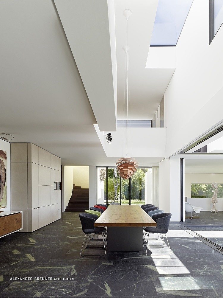 Following the entrance hall the large dining table is placed below a two-storey void and lit by a skylight.