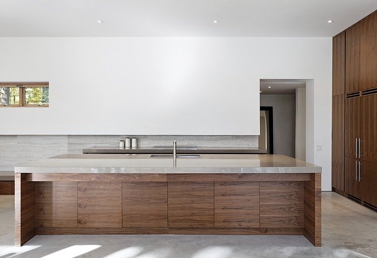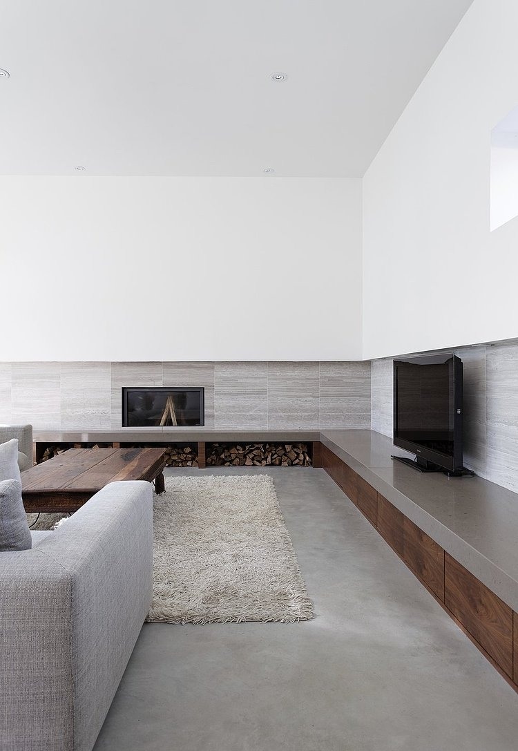 Approaching the house from the north you are presented with a resolutely understated façade with minimal glazing. Once inside the home you are struck by spectacular views from large picture windows that make up most of the southern building face. The minimalist inspired interiors compliment the rugged surroundings enhancing the beauty of the landscape and making it an integral part of the design. The simple restrained material pallet of stone, wood, concrete, and white walls contribute to the elemental feeling of the house.