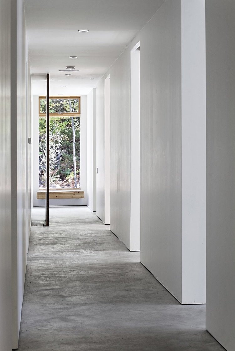 Ultimately the design demands little of the site and its resources. The residence sits in the midst of the treed lot, with minimal east-west glazing, and large trellised overhangs above south facing windows. This optimizes views and day lighting, while minimizing solar gain. To ensure a comfortable interior climate the building envelope features insulated concrete form walls and a spray-foam insulated roof. The home is heated by a zoned radiant floor system via a high efficiency boiler supplemented by a heat recovery ventilation system. While the concrete floor slab is the source of heat, it also serves as a heat sink in the winter months and helps keep the home cool during the summer. The house does not have, nor does it require, an air conditioning unit for cooling. Both the north and portions of the south windows are operable permitting natural cross ventilation, further contributing to the comfort and natural feeling of the home. The disciplined use of materials, balance of environmental and design impacts, and optimization of the client’s prescribed budget, were all considered as carefully as the spatial qualities of the home.
