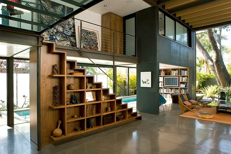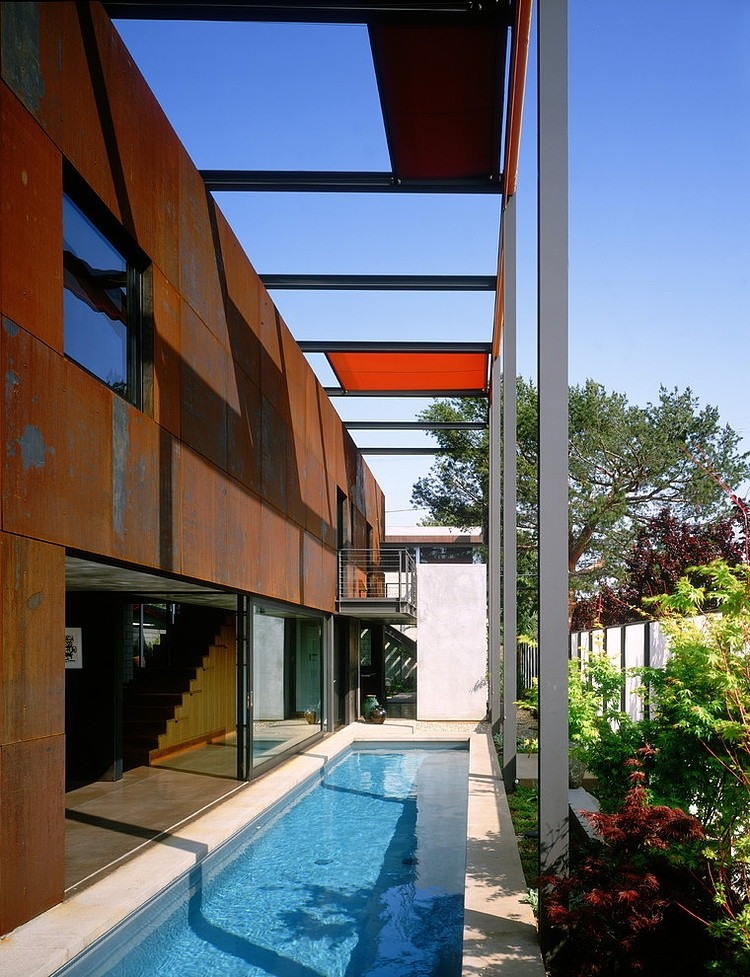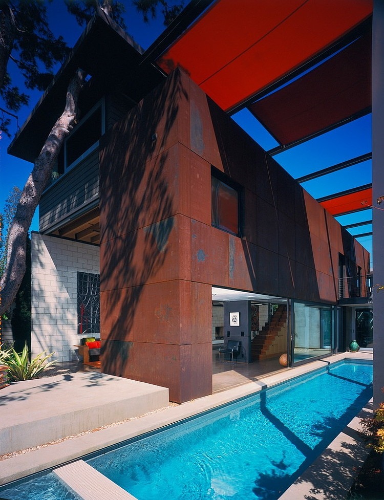 This sustainable residence designed by Ehrlich Architects is located just a half mile from the Pacific Ocean, in Venice, California. The exterior features maintenance-free Cor-ten steel, Trex, copper and stucco.