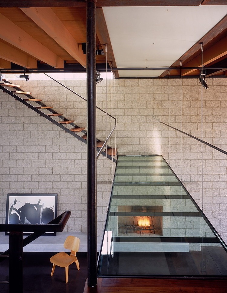 Space is calibrated within the house for maximum efficiency and dramatic impact. The low entrance explodes into the 16-foot-high main living/dining area. A glass bridge hung from narrow steel cables spans the volume, connecting two small second-story bedrooms with floating stairs to the master suite and study on the third floor.