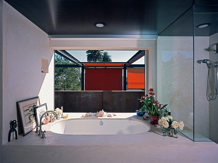 The house is strikingly transformative, with large expanses of glass that open on three sides, with a combination of pivoting, sliding, and disappearing pocket doors. On sultry days the house, which has no air-conditioning, is a cool and breezy pavilion. A steel exoskelton is fitted with electrically-operated canvas shades that open and close to temper the sun and turn the pool court into a sheltering tent.