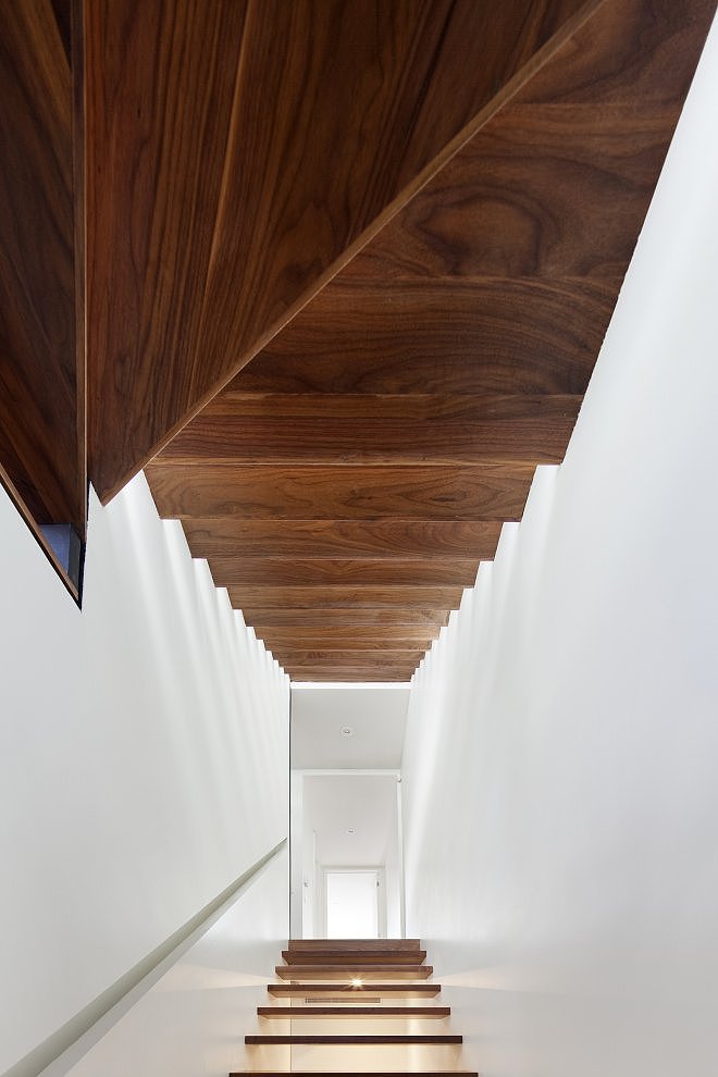 Stacked vertically along the party wall from the basement to the third fl oor, a repositioned, porous stair improves the fl ow of light and sight lines. The stair’s open risers and direct proximity to full height windows at the top, allows light to bathe the house’s interior spaces. At each level below, the stair is delineated by a defi ning black element. Be it tall black bookcases housing the owner’s colourful collectibles on the ground fl oor, or a chalk board wall for play on the second fl oor, these bold, dark pieces, in combination with rich walnut fl oors and crisp white walls and ceilings, create contrast to produce an intensifi ed effect. The monochromatic palette highlights the house’s architectural forms, and is animated by the family’s collection of colourful