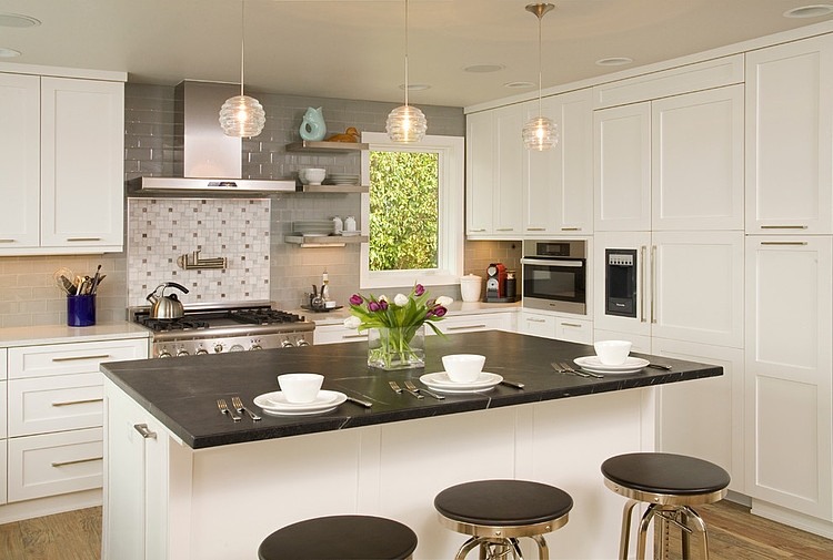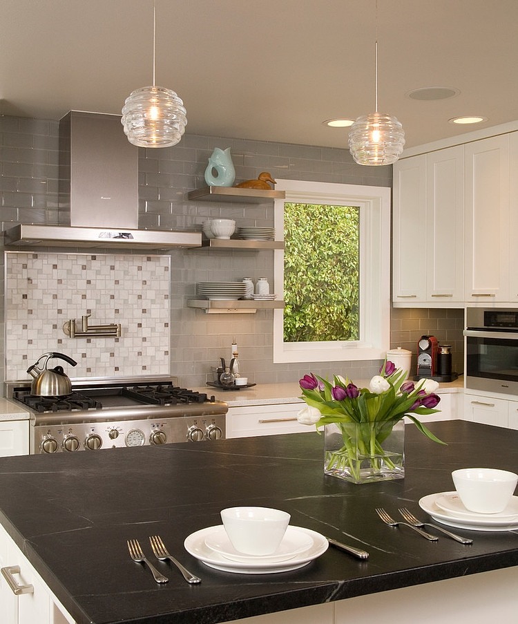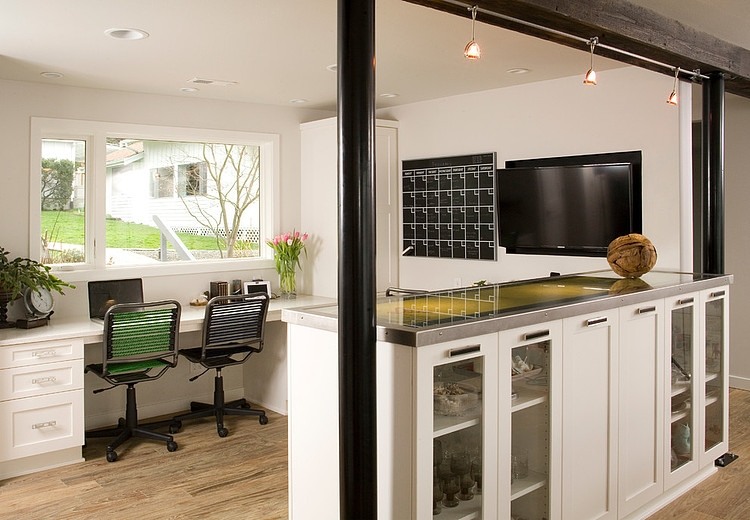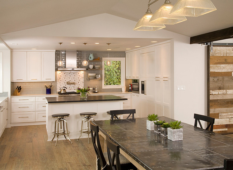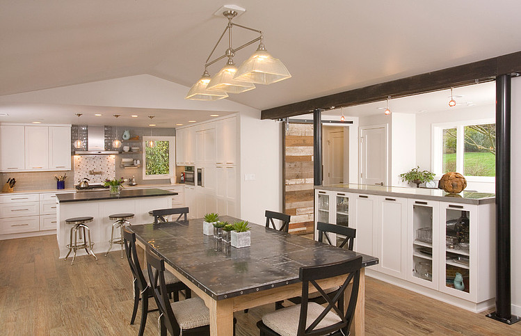 This once was a house where the kitchen faced away from the view, the window wall was bowed out, small windows faced the view and the interior needed a change to match the eclectic style of the owners. Now the kitchen faces the water, the windows are large sliding doors to the deck and secure(!), and the finishings show the eclectic sophistication of the homeowners.