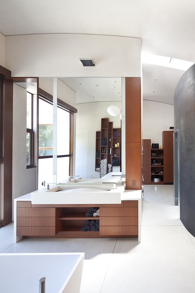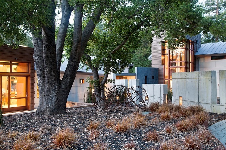 Carefully sited among very large existing Oak trees, this house is defined by a series of inter-connected vaulted roof structures. Courtyards and outdoor spaces united house and landscape. The pool and adjoining patio step down to a large grassland area to the north.