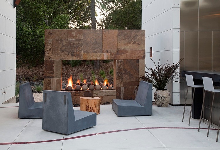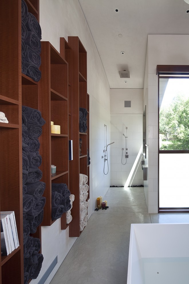 A modern palette of materials including swiss pearf cladding and fundermax siding enhance the strong presence of the house as it sits in its lush surrounding. Natural stone, concrete, plaster, and Wallnut wood are some other materials that make up the dynamic mix of materials on the interior.