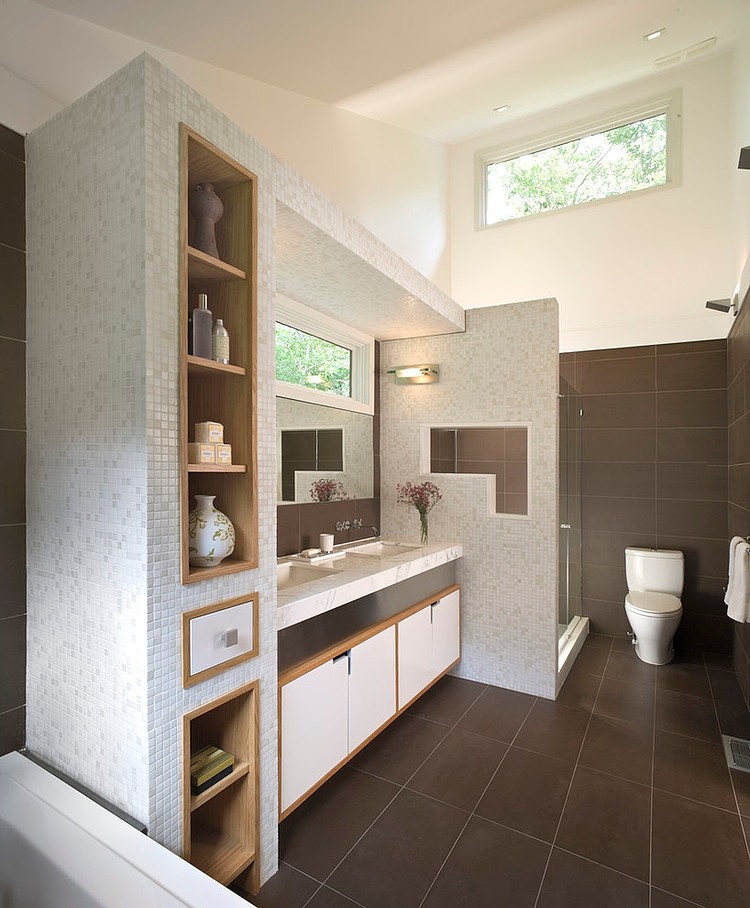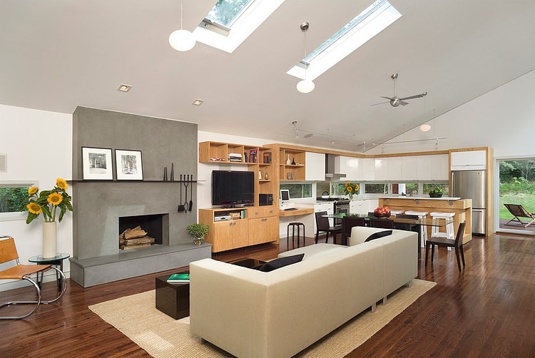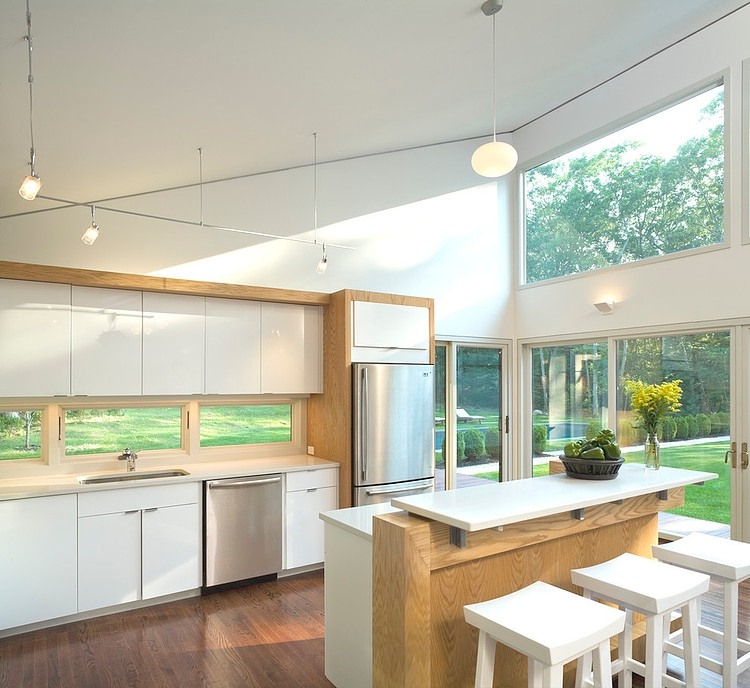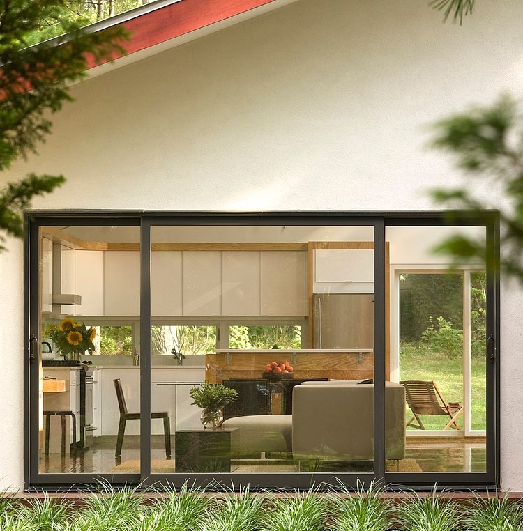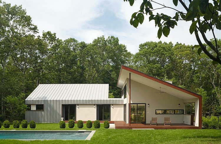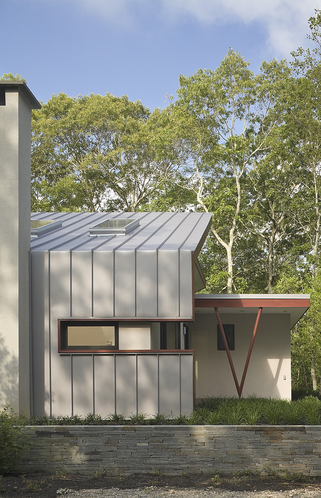 Tucked away in the Northwest Woods of Long Island’s East Hampton, this award-winning home by Eisner Design conveys a clearly articulated harmony between the house and the landscape. Protectively wrapped by a standing seam metal roof, the modernist three-bedroom structure is composed of two rectilinear stucco volumes. At the entrance, a low stone wall containing landscaped plantings matches the level of the interior floor, effectively extending the floor plane of the indoor living area outwards. From the L-shaped kitchen, the roof and floor extend out to become a covered outdoor dining deck. All major glazing is directed through the house toward exterior vista corridors Green concerns were a major factor in choosing materials, finishes and plantings throughout the house. The reflective metal roof limits interior heat gain, thereby reducing cooling loads. All plantings in the landscape are indigenous to the local environment, and materials and finishes were chosen for their recycled content and low VOC ratings. This project was recently awarded the AIA Peconic Merit Award for Architecture and the ATAS Project of the Year award.