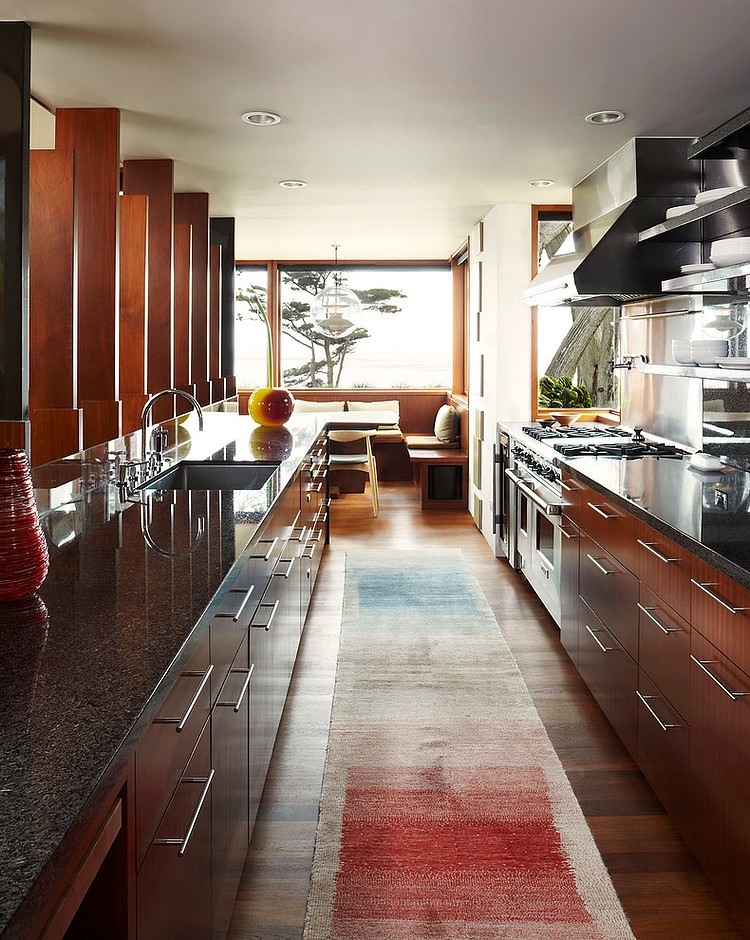 The house sits on a dense site facing Carmel Bay and the Pacific Ocean. Our clients were keen to be fully cognizant of this amazing setting in all areas of the home. As such the house was conceived as a central room comprised of the courtyard, living room, and bedroom, bordered by niche spaces for the kitchen, breakfast nook, office and master bath. Fully folding doors/walls adjacent to the courtyard from the living room and bedroom literally open the full space up, and the rhythmic edge of vertical screen elements (solid mahogany and steel) create a loose border that stretches and compresses along its lengths.