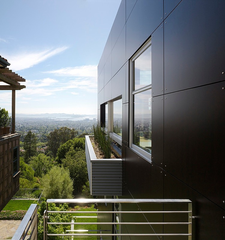 The house exterior was designed to maximize the use of renewable materials. The cladding panels on the garage portion are concrete fiberboard (green) from Switzerland , the house itself is clad with resin fiberboard that is made to look like wood also renewable, from Holland. Most decks are tiled with ceramic slats the look like wood (again to minimize the use of real wood). The roof is powder coated metal and most of the trim is anodized aluminum to match the giant doors facing the view. I tried to make the house as “green” as possible, but my main goal was to make it as maintenance free as possible, considering the western exposure. All of the exterior materials require only a power wash every once and a while. No painting, warping, discoloration…