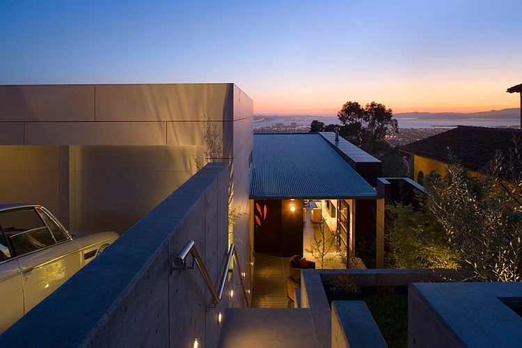 Sunken down into the hill, it allows for direct level access to a back yard and opens up a generous entry courtyard to the house as well as a series of level gardens as one makes their way through the house, challenging the notion of perched hillside home, detached and offering no direct access and dialog with the land and their surroundings. The whole western façade slide open making the indoor spaces one with the Bay.