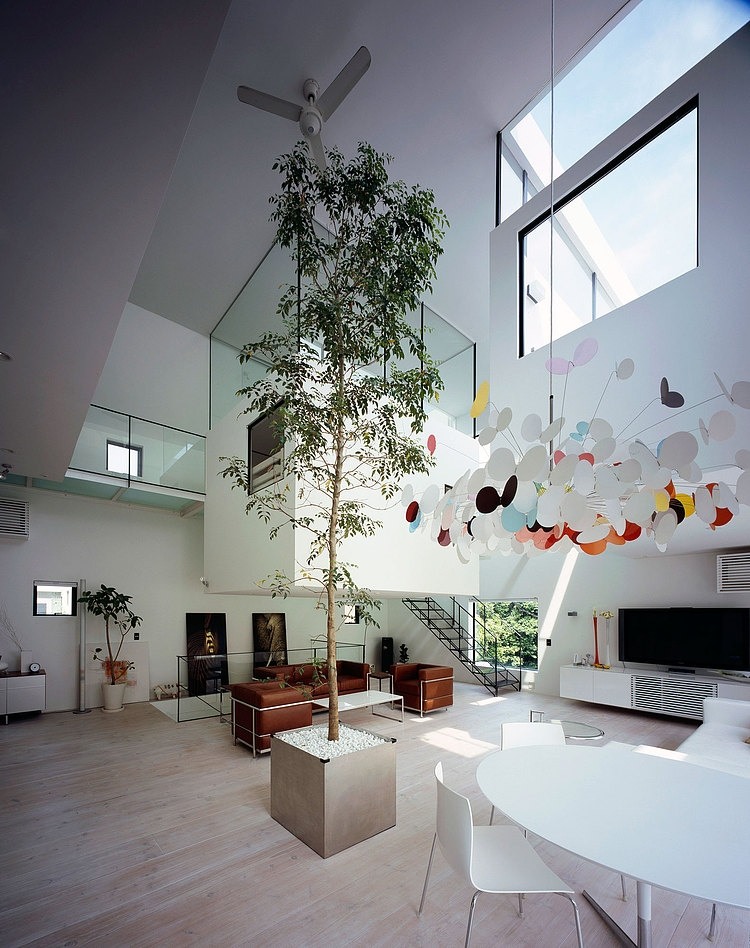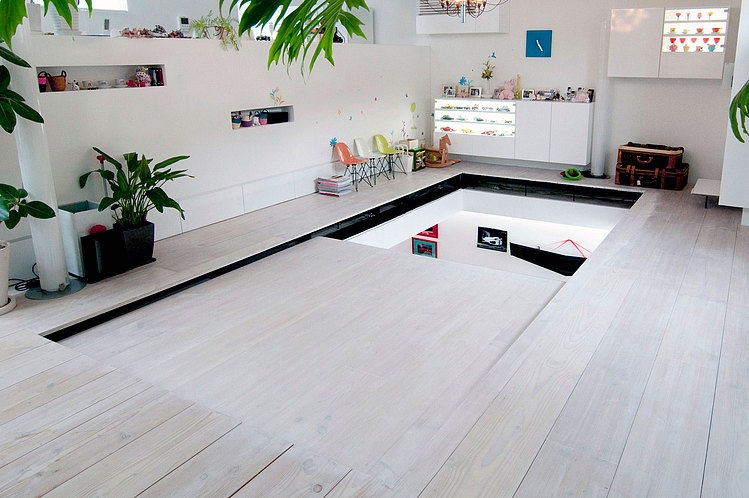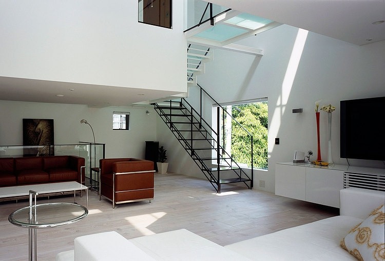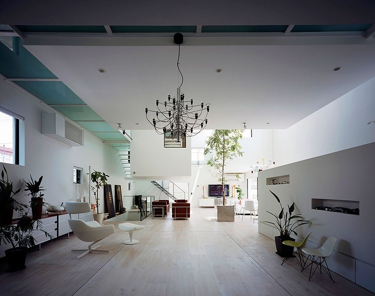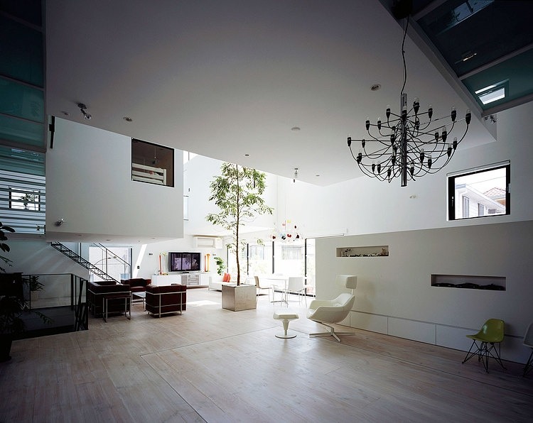 Though there are numbers of large scale items in this house, instead of setting the usual layer of floors, random floating boxes make the spacious living area possible.