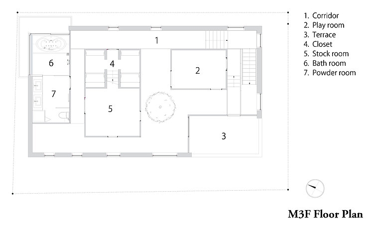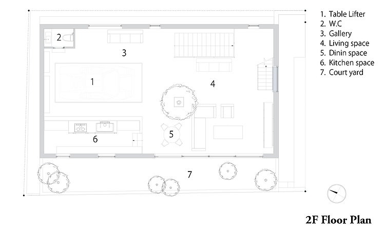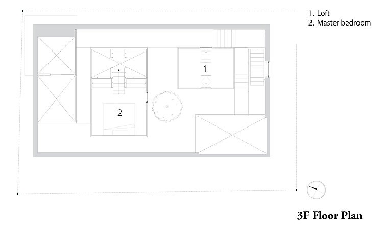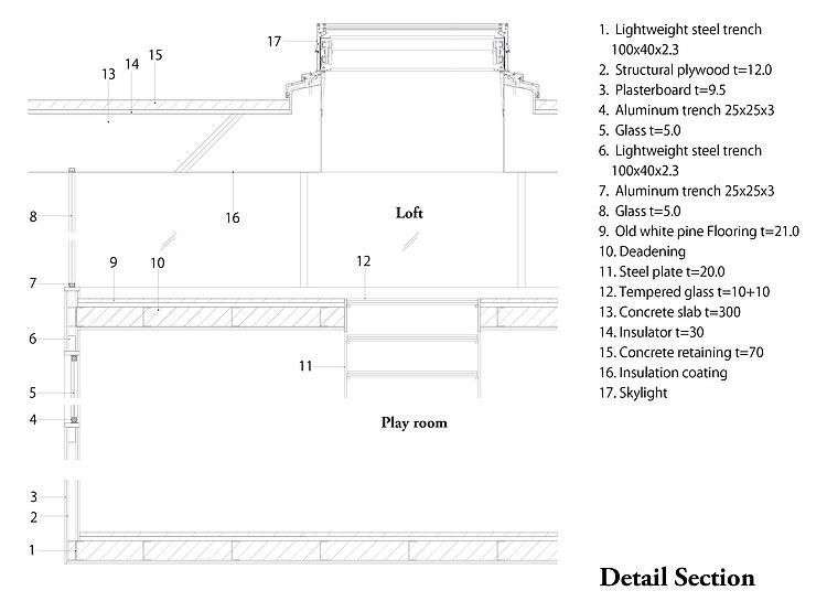 Various height and size rooms are floated randomly in the big living space. Structurally, light steel structure boxes are hanged from or attached to the reinforced concrete box. These randomly floating boxes keep adequate distance and height with the car and the high tree and create attractive open space. Spaces under the boxes have invisible borderline and each space has the different functions according to the height.