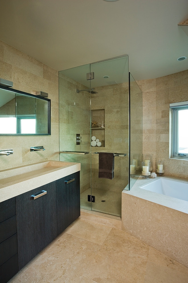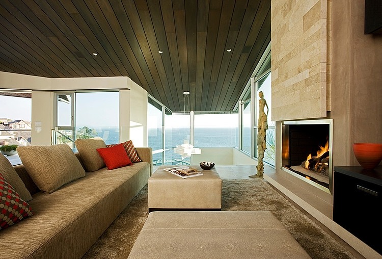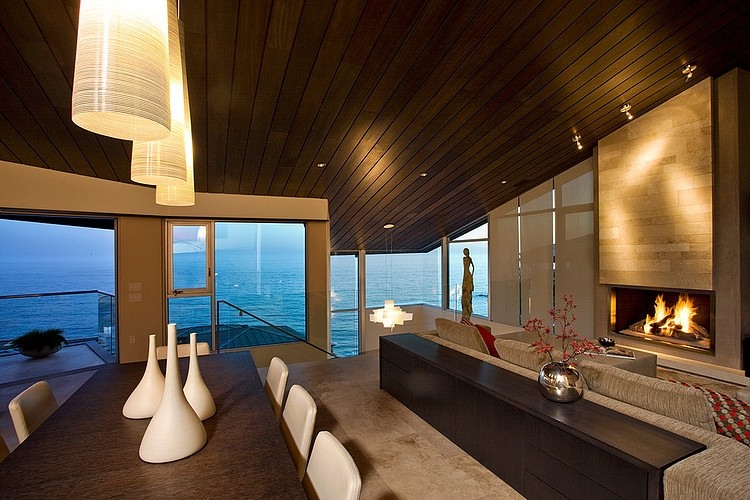 Interior spaces are connected seamlessly to exterior spaces by pocket doors and a continuity of materials. Travertine, mahogany and Rhine-zinc, gently woven into the composition, root the structure in the seaside terrain and provide spatial synthesis. The openness of the interior spatial plan invites a magnificent play of light upon these surfaces.