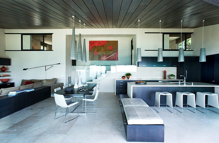 While a new dynamic, spatial configuration is created by the elimination of interior walls and some floor areas. Exterior openings have been modified to maximize expansive ocean views, breezes and natural light. A vacation home for a family of four including two children, the design responds to the requirement of the family for flexibility of use.