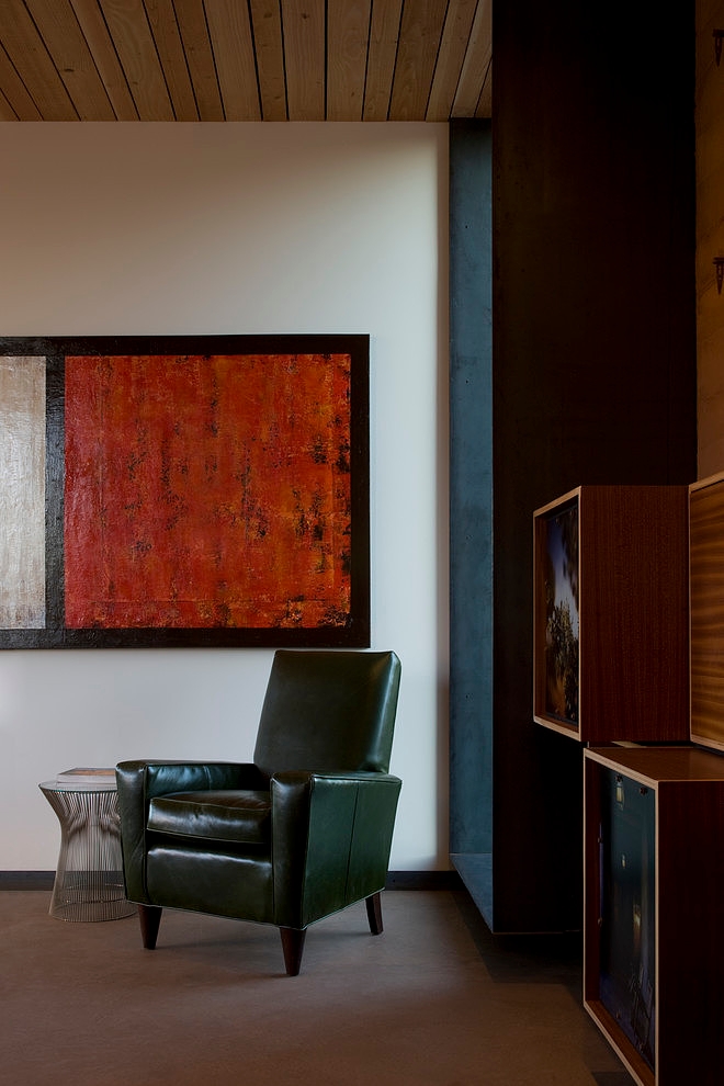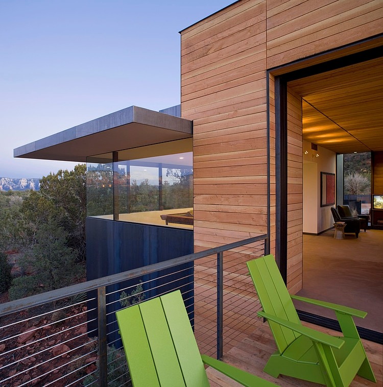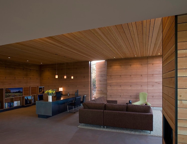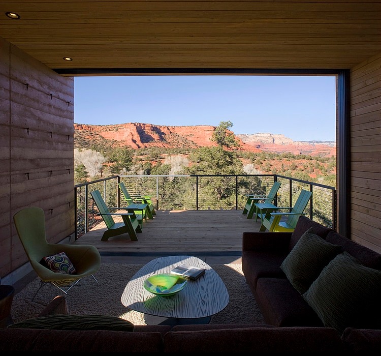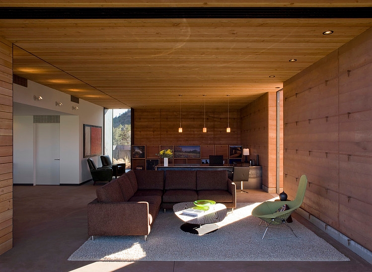 Our vision for excellent architecture is best demonstrated by The Perch, The Aerie’s on-site sales studio completed in early 2009. The Perch blends simple orthogonal forms and a refined palette of materials that live naturally in the surroundings of the Red Rock Secret Mountain Wilderness. A tall, 24-inch thick mass of rammed earth forms the south and west walls of The Perch, paying quiet reverence to the colorful strata of the sandstone cliffs beyond.