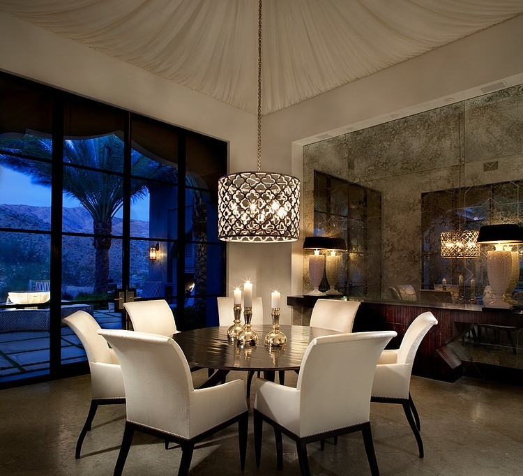 Casbah Cove is likely the most innovative home in the desert, built high on a hill of the canyon side of Bighorn, surrounded on three sides of BLM land with unobstructed views of snowy mountains and glittering valley lights below. Ascend the winding driveway, dotted with Moroccan gas lanterns, to reach the oversized motor court adorned with date palms submerged in a sweeping water feature. The impressive main entrance boasts enormous sliding doors that articulate the workmanship consistent throughout the home. Craftsmen from Morocco spent many months at Casbah Cove estate, carving wood, stone, plaster and brass. Step through the doors and observe an expanse of jaw-dropping mountain and valley views. In the foyer, the sliding doors are flanked with dual fireplaces and overhead you have star-shaped skylights. A truly amazing 30’x40′ retractable glass ceiling over the courtyard.