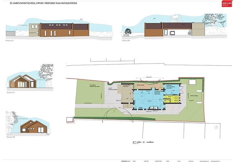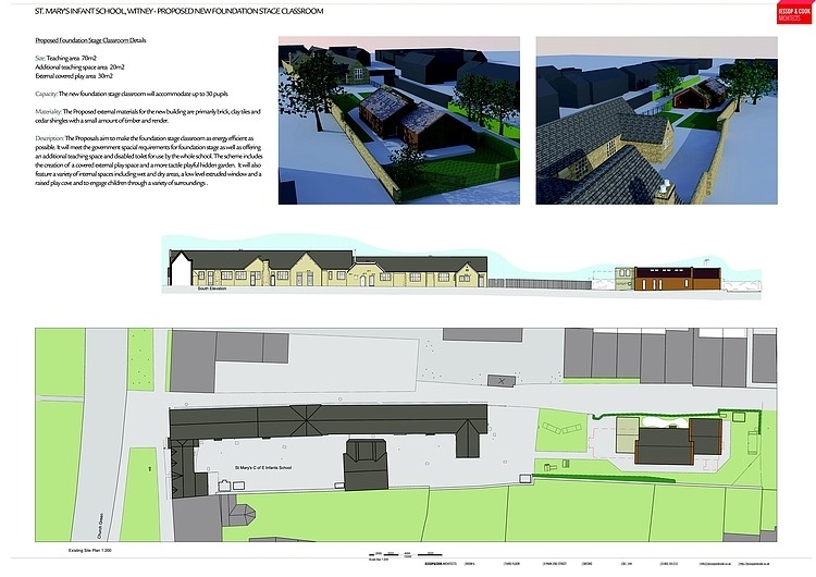 This application is for a new foundation stage classroom at St Mary’s CE Infant school, 17-19 Church Green Witney, where the school premises are currently inadequate for a foundation stage classroom’s spatial requirements. This issue led to the commission of Jessop and Cook Architects to produce a design for a new foundation stage classroom with an additional teaching space which included the demolition of the existing canteen building.