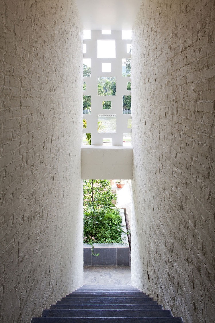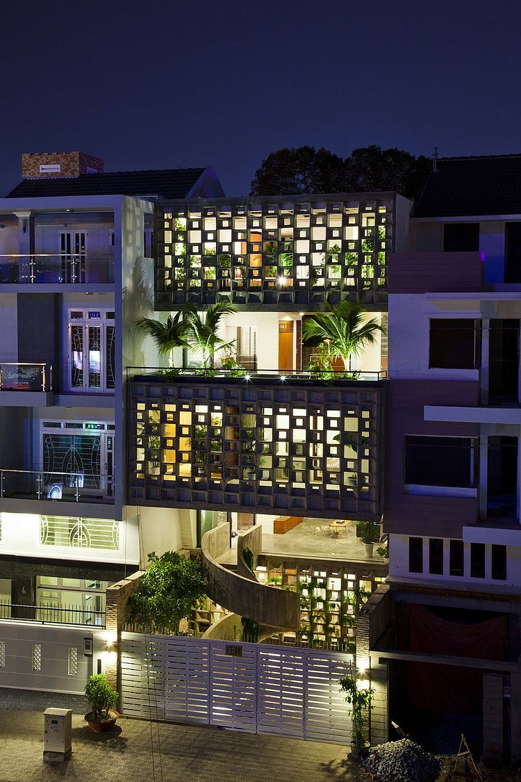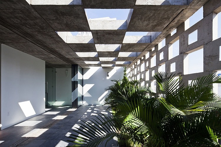 Pattern blocks, which used to be a popular shading device in Vietnam to get natural ventilation, are made of pre-cast concrete with 60cm (24in) width and 40cm (16in) height. It not only prevents the harsh sunlight and heavy rain but also enhances the privacy and the safety.