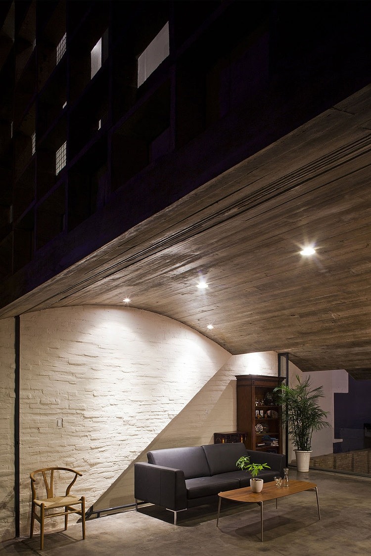Bedrooms and other small rooms are contained in the floating semi-closed volumes to enhance security and privacy. On the other hand, the open in-between spaces are designed to be independent living spaces for two families.
