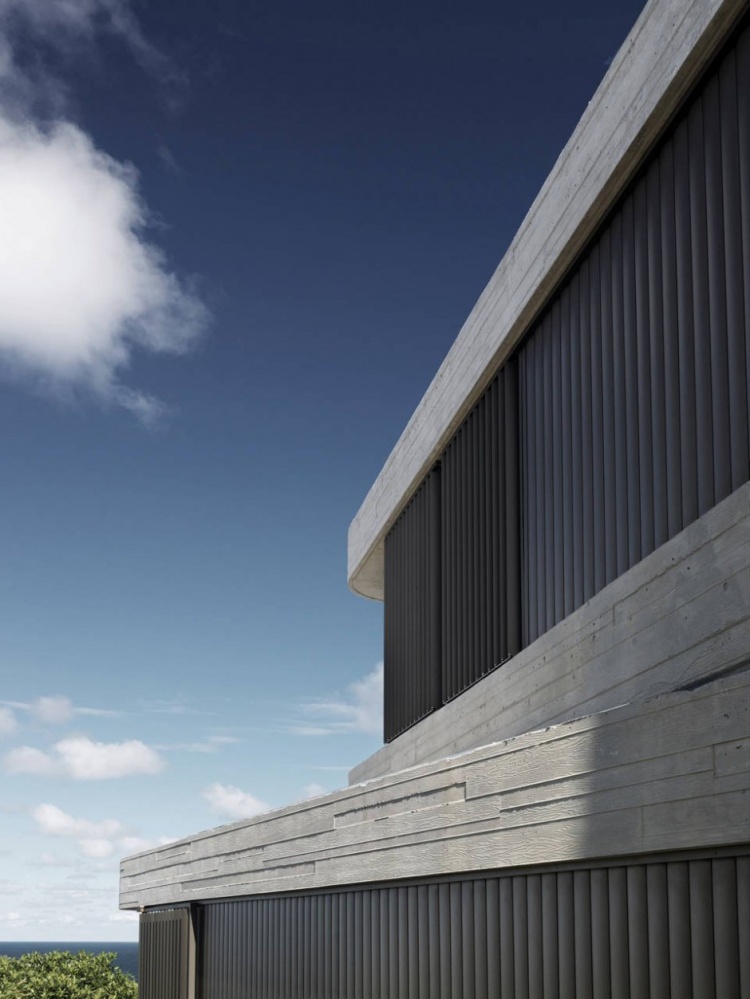 Crafted for longevity, the residence employs off-form concrete slabs and beams, letting the structure cantilever with elegance. Windows and bespoke wall cladding find harmony with ellipsoid aluminum louvres. These elements guard against the harsh seaside climate. Blending seamlessly, a medley of new and reclaimed wood, and sandstone echo the house’s natural surroundings.