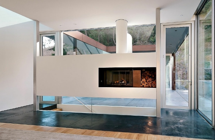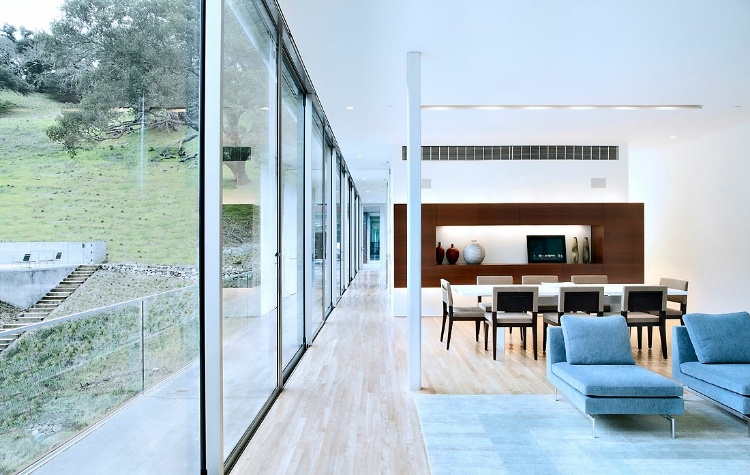 The house is a continuous 22′ wide two-story bar. A stair leads up to the entry court. The living areas are the upper level and have continuous glass walls which look north to the hill. The bedrooms below have continuous glass walls, which look south to the theater in the landscape.