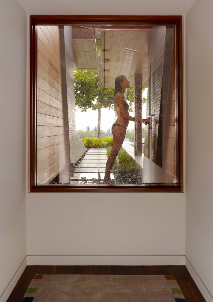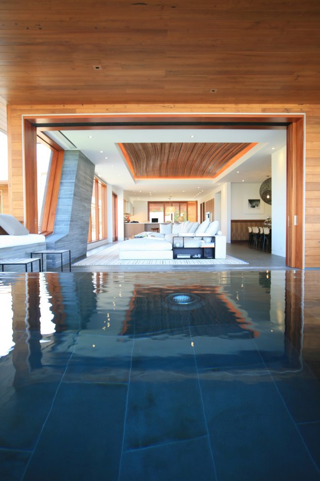 To help maintain the environmental sensitivity of the house, two separate arrays of roof mounted photovoltaic panels offset the residence energy usage while the choice of darker lava stone help heat the pool water via solar radiation. Rain water collection and redirection to three drywells that replenish the aquifer are implemented throughout the property. Reclaimed teak timber from old barns and train tracks are recycled for the exterior of the home. Coupled with stacked and cut lava rock, the two materials form a historically driven medium embedded in Hawaiian tradition. Local basket weaving culture was the inspiration for the entry pavilion which reenacts the traditional gift upon arrival ceremony. Various digitally sculpted wood ceilings and screens, throughout the house, continue the abstract approach to traditional Hawaiian wood carving further infusing traditional elements into the contemporary arrangement.