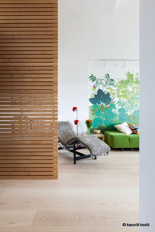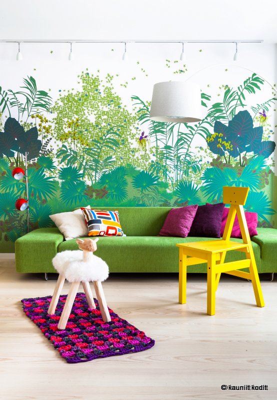 The partial demolition of walls was a natural consequence, along with reversing the location of the bedroom and living room. After fixing this, we decided on the overall “concept” together with my customer, organizing all the details that colored the white spaces. That happened during my customer’s visit to Rome (due to my impossibility to travel in that period), and via 4oo e-mails between Turku and Rome. The result is what I now consider my style: a blend of cultures. There is nothing that stimulates me more than to study different countries and make some cultural themes recognizable but never intrusive in the project. In this case, the floor is covered with parquet of white ash, the shelves are birch and the kitchen table is also birch but colored with heat. Wood is a omnipresent element in this flat as it constantly is for Finnish people, but the real attention is catalyzed by the nature theme pictured on wall paper, carrying colours and contrasts and a typical Mediterranean “courage”. The furniture itself is a mix of the 2 cultures and of past & present: the grandmother’s armchair is a piece of Finnish vintage from the sixties as is the red floor lamp. The arc framing the wall paper is the famous Twiggy by Foscarini and the suspended lamps are Italian as well:Olimpia by Ideal Lux. Everything fits together in perfect harmony!