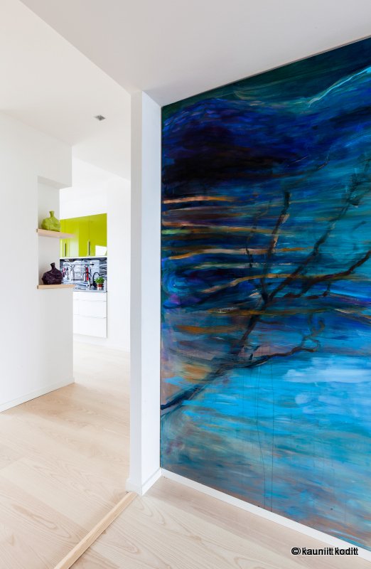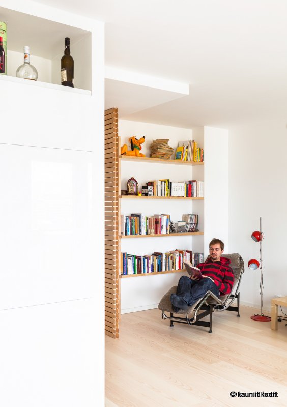 The apartment is a little penthouse (about 65 mq.) in Turku, Southern Finland. Before renovation, too many walls and doors blocked the spaces and the passage of light, and the most beautiful view of the historical sites of Turku was on the bedroom side. My principal goal in this project was letting the light flow in and creating a relaxing living room where my customer could do his creative work.