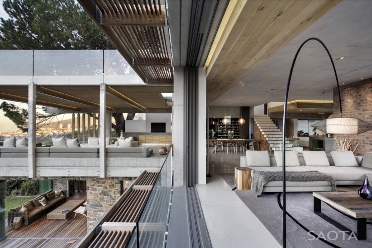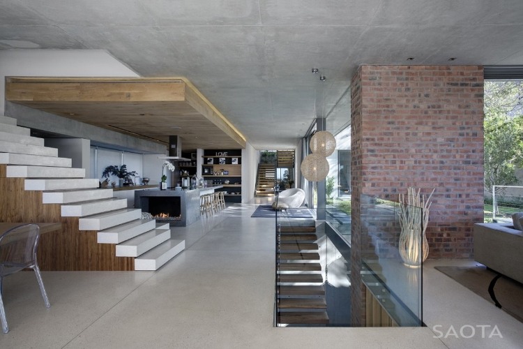 SAOTA relied on robust uncluttered finishes of off-shutter concrete for soffits and various walls, painted bagged brickwork, specialized polished concrete topping and oak cabinetry and ceilings. To amplify the sense of openness of the rooms and the gardens, the living rooms have large openings of sliding aluminium doors – this openness is further enhanced by glass handrails to successfully blur the boundaries of interior and exterior. The kitchen remains the focus of the first floor area, and the main outdoor braai terrace is a generous layout with outdoor sitting and dining areas. The upper level of the house – to which one approaches on arrival at the property – accommodates 4 en-suite bedrooms with good views and a large study / library area. The garage screens the courtyards from the street.