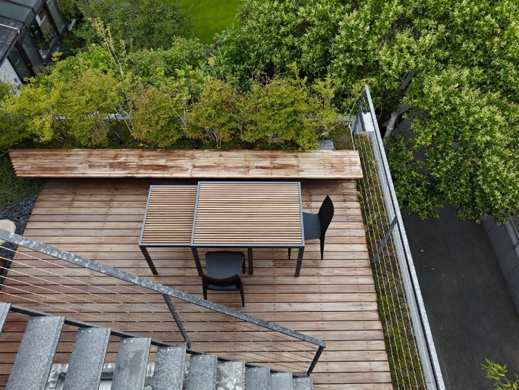 The house includes many gardens on each floor of the house, to bring the surrounding landscape into the house. In the end, the house will be part of this larger landscape, and in the meantime the green surroundings will help with privacy.