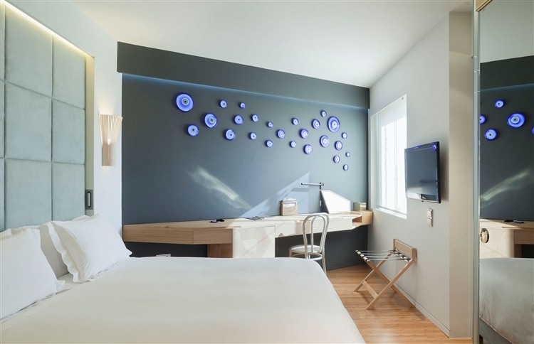 POSTCARDS of old Athens, a nod to retro tourism executed with a very modern design twist. Arranged haphazardly on the room walls, they are a reminder of the now lost custom of sending travel souvenirs, replaced today by short emails and snapshots taken with mobile phones. the EVIL EYE, a bead charm used to guard against ill omen and bad luck. The traditional form of ‘Evil Eye’ motifs is revisited on a psychedelic note with rear-lit LEDs that form a starry sky on guestroom walls.