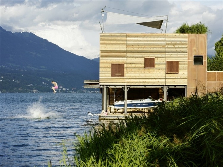 Minimalistic modern boathouse designed by MHM architects located at the Seebodner lakeside of the Millstätter lake in Carinthia, Austria.