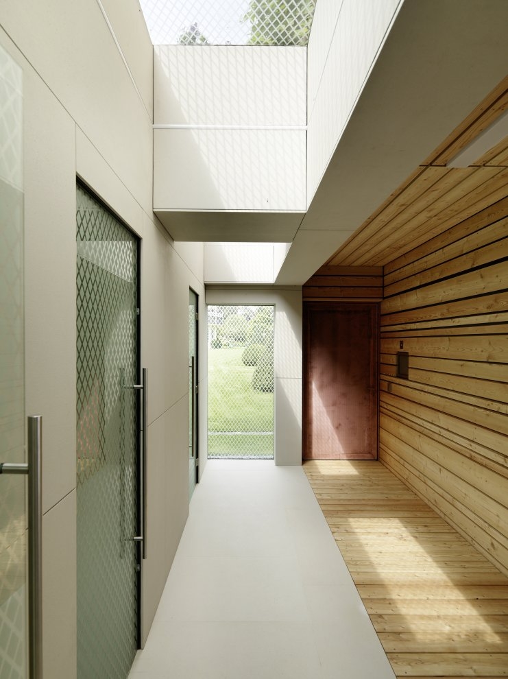 On the other hand, this setup also meant an essential formative element in the development of the building design: the construction body subdivides itself into those parts of the building erected over water and those over ground, the original shoreline can be read off the two different materials in the facades. Moreover the wish for a grown appearing house, which in the course of the years is permanently variable in its appearance, stood in the foreground: thus it seems that the building, alike a reed belt, grows out of the water of the lake. The components established over water manifest themselves completely in wood, while those established over soil are wrapped in a cover of expanded copper. Both selected materials, the untreated Siberian larch as well as the natural copper panels are subjected to a natural weathering process which gives the building an annually changing in its appearance, until the wood has turned completely grey and the expanded metal panels are totally covered with the green patina typical for copper.