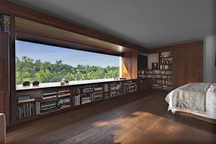 The private areas are located at the top floor in which large windows were also incorporated to make the most of the views. In the master bedroom the window is framed by a bookcase designed specifically for the needs of the space that enhances the view and makes it cozier. The bathroom is a large space from which you can also enjoy spectacular views; the washbasin was located at the center.