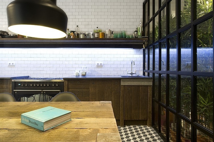 In the home of Santa Caterina is reflected unequivocally contemporary trend is blurring, among others, the border between the public and private spheres of the house. Such is the case of that hide getting opaque border areas and private service, hopelessly separated from the social rooms. Thus, this re-interpretation of the typical floor Eixample, rather than articulated through a broker, elects instead to turn around a large kitchen, which built on the traditional cement floor tiles, is offered as an area with deep social and entertainment vocation beyond its simple functionality and service unit. Crossing the floor longitudinally, the kitchen includes a third of the floor area of the house and it is thanks to their balconies, their shelves-sofa converted into banks, their wide table made of wood and solid nature; their seats and fixtures Contemporary design your old apothecary dresser wrought iron and marble, and its art appliances hidden behind a facade of wood recovery stay becomes the stylistic summary of home and leading large space, deeply extroverted and hedonistic housing makes this representation space of a new lifestyle.