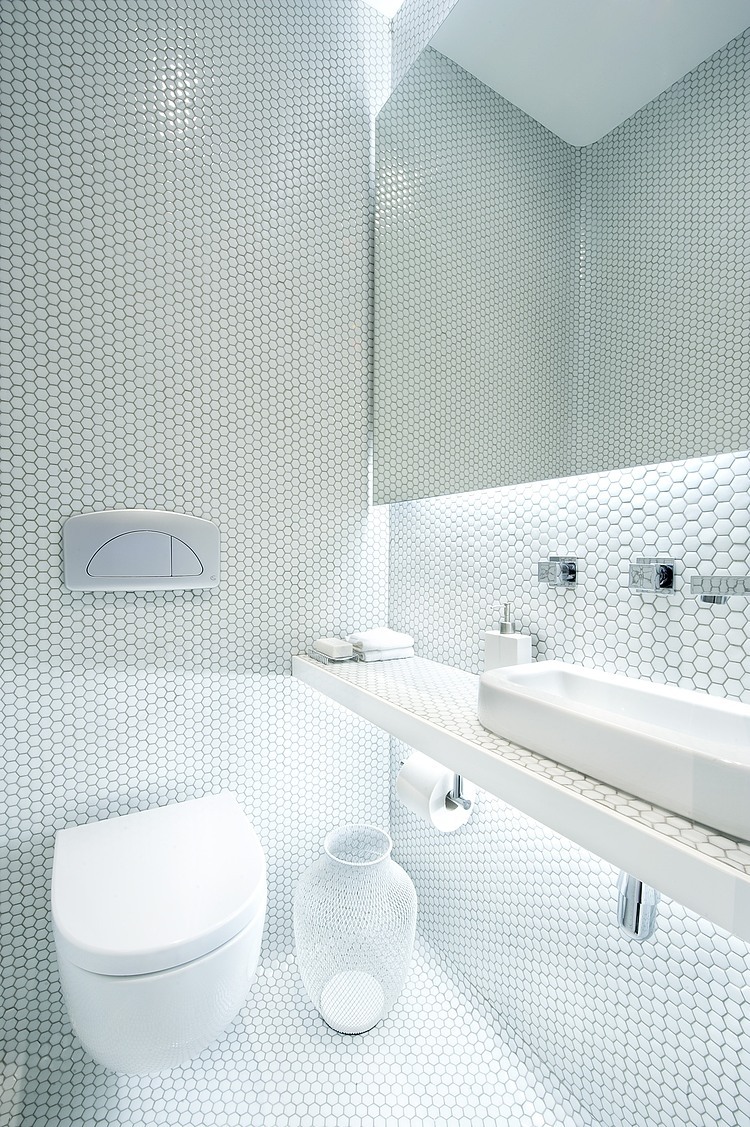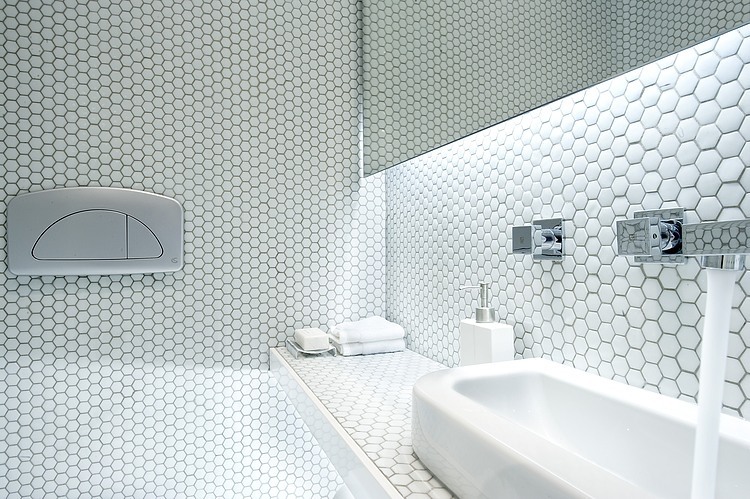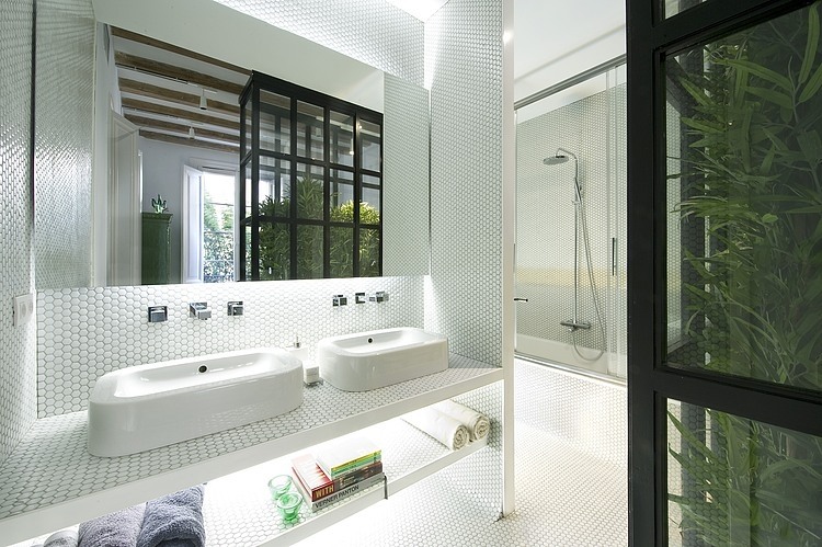 Avoiding the transition spaces: hallways, “halls” and aisles separated by partitions, you get a general sense of openness promotes uniform propagation of natural light and ventilation, while to some extent resignation strict privacy zones “intimate” I used to be in opacity, shadows, and specialized spaces constrained dimensions. That is why the rooms of this house, but can be closed after towering double doors adorned with classic moldings and metal handles, can only open up to the bathrooms by transparencies and reflections given by two major domestic gardens bordered by large windows made extent lacquered woodwork. Consequently, the bathrooms are treated here as relaxation areas that should enjoy the breadth and the preferred lighting that usually stays only enjoy more social. However, discretion is not sacrificed at all: The curtain generated by the bamboo plant inhabiting successive internal gardens achieves ensure transparency of glass, offering the user the necessary privacy without sacrificing light or amplitude. Marble recovery; white glass mosaic with half round rounded corners, fittings and stainless steel fittings, large transparent glass partitions and new walls a vibrant green plant eventually set three instances traditional hygienic offering very little in return great comfort and originality.