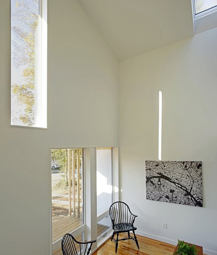 The Chasen Residence is in a hip and growing, yet historic, neighborhood several blocks east of downtown Raleigh. Representing a new house type in Raleigh, this house is affordable, small, modern and urban. The efficient plan confines the entries, stairs, hallway, kitchen, and half bath to one side of the house, opening up the rest of the space for living. The house has an efficient envelope and uses several sustainable strategies to collect and preserve energy. The upper floor is pushed towards the back of the lot to create a double-height living space at the street and a screened porch fronting the back yard. Total construction cost was $117 per square foot.